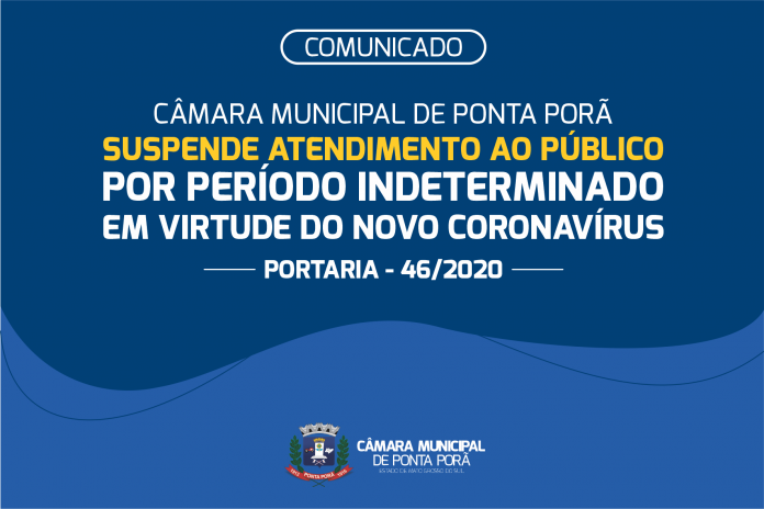 Em virtude da pandemia do coronavírus (Covid-19), a Câmara Municipal de Ponta Porã publicou a portaria n.º 46/2020, que resolve suspender partir desta segunda-feira, 23 de março, o atendimento ao público e as atividades internas, como sessões ordinárias, solenes, extraordinárias e reuniões. As deliberações da portaria vigorarão por tempo indeterminado.