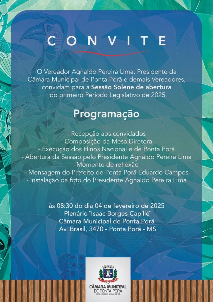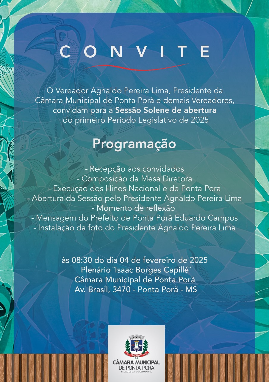 A Câmara Municipal de Ponta Porã convida a comunidade fronteiriça para a Sessão Solene de abertura do primeiro Período Legislativo de 2025, que será realizada no dia 04 de fevereiro, às 08h30, no Plenário “Isaac Borges Capillé”, na Câmara Municipal de Ponta Porã