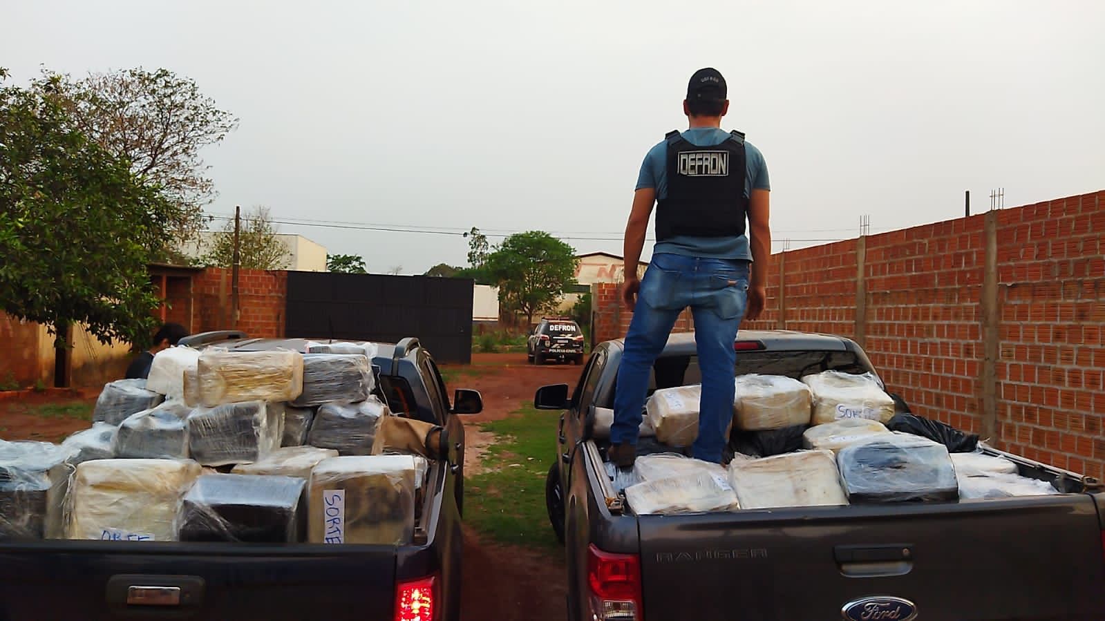Como as investigações apontaram que uma carga de maconha estaria na iminência de ser retirada do local, com destino a Campo Grande, na tarde desta terça-feira os policiais da DEFRON realizaram incursão no imóvel, momento em identificaram em uma edícula dezenas de fardos de maconha. Também, três tabletes de pasta base de cocaína foram identificados.