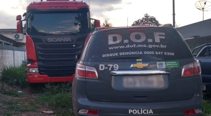 Policiais do Departamento de Operações de Fronteira (DOF) apreenderam na tarde de quinta-feira (7), por volta das 18h, o veículo Scania/R 440 de cor branca e placas de da cidade de Água Doce (SC), com registro de Furto.