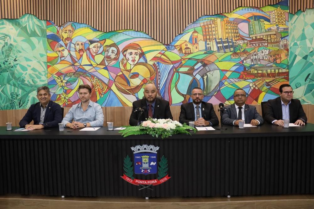 Durante sessão solene na manhã desta quarta-feira, dia 27, a Câmara Municipal prestou homenagens à diversas personalidades que ajudam no desenvolvimento econômico e social de Ponta Porã. A Mesa que dirigiu os trabalhos foi composta pelo presidente do legislativo, Agnaldo Miudinho; 1º secretário Kleber Ortiz; 2º secretário Jelson Bernabé; 2º vice-presidente Marcelino Nunes; e pelo secretário de Obras e Urbanismo, André Manosso, que representou o prefeito Eduardo Campos; e o delegado regional de Polícia Civil, Clemir Vieira Júnior, que foi um dos homenageados.