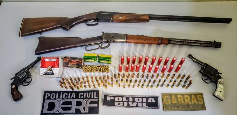Informações da Assessoria de Comunicação da Polícia Civil de Mato Grosso do Sul, dão conta que na propriedade foram apreendidas uma carabina puma, calibre 357; uma espingarda, calibre 28; um revólver, calibre 38; um revólver, calibre .32; duzentos e vinte e sete munições, sendo: cinco calibre 38; uma de calibre 9mm; trinta calibre .38; vinte calibre .28; quarenta e sete calibre .32; onze calibre .357, além de outras cento e treze calibre .22.
