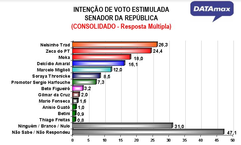 A pesquisa DATAmax revela que na intenção de voto estimulada ao Senado, levando em conta o consolidado das respostas, ou seja, a primeira e a segunda escolha do eleitor, Nelsinho Trad tem 26,3% da preferência. A lista segue com Zeca do PT (24,4%), Waldemir Moka (MDB) com 18%, Delcídio Amaral (PTC) com 16,1% e Marcelo Miglioli (PSDB) com 12%.