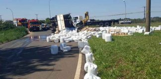 Carreta tomba, derruba carga de herbicida e fecha entrada da BR-163