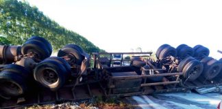 Carreta carregada tomba e MS 164 está interditada nas proximidades da...