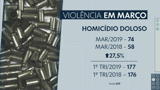 - Número de casos de homicídios subiu de 58 em março de 2018 para 74 em março de 2019 (27,5%)