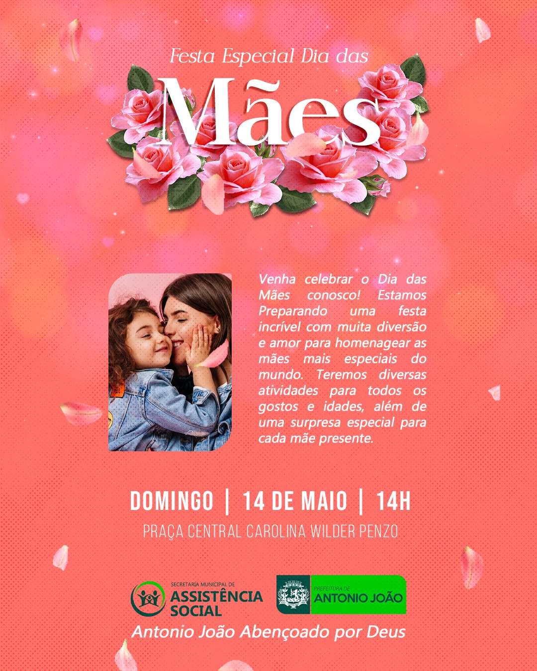 Junte-se a nós no dia 14 de maio, domingo às 14h, na Praça Central Carolina Wilder Penzo para uma festa inesquecível. Teremos muita diversão, amor e entrega de presentes para homenagear as mães mais especiais do mundo.