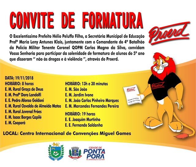 A Prefeitura de Ponta Porã e o 4º BPM – Batalhão de Polícia Militar realizam no próximo dia 19, no Centro de Convenções, solenidade de formatura do PROERD. O prefeito Hélio Peluffo, a Secretária de Educação, Leny Klais e o Tenente Coronel QOPM Carlos Magno da Silva, comandante do 4º BPM convidam a população para o evento. Nesta nova turma, serão aproximadamente mais 400 crianças recebendo o certificado de participação.