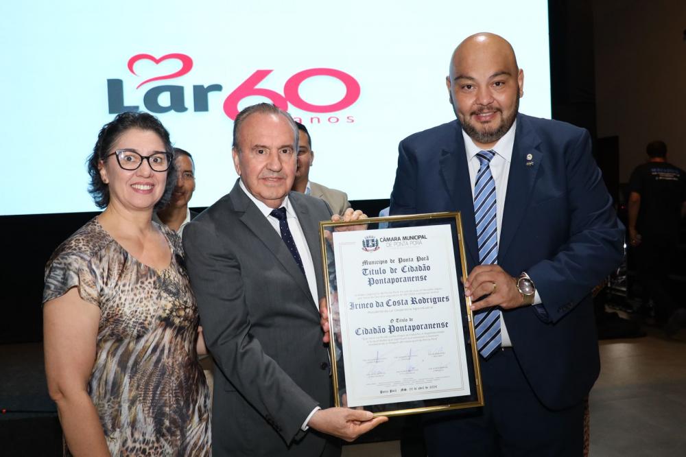 O diretor-presidente da Lar Cooperativa Agroindustrial, Irineo da Costa Rodrigues, foi homenageado com o título de “Cidadão Pontaporanense” durante evento festivo no salão do Hotel Pousada do Bosque em comemoração aos 60 anos de criação da cooperativa no interior do Paraná. A homenagem foi entregue pelo presidente da Câmara Municipal, Agnaldo Miudinho, juntamente com vários vereadores e o deputado estadual Paulo Corrêa, que representou no ato a Assembleia Legislativa de Mato Grosso do Sul.