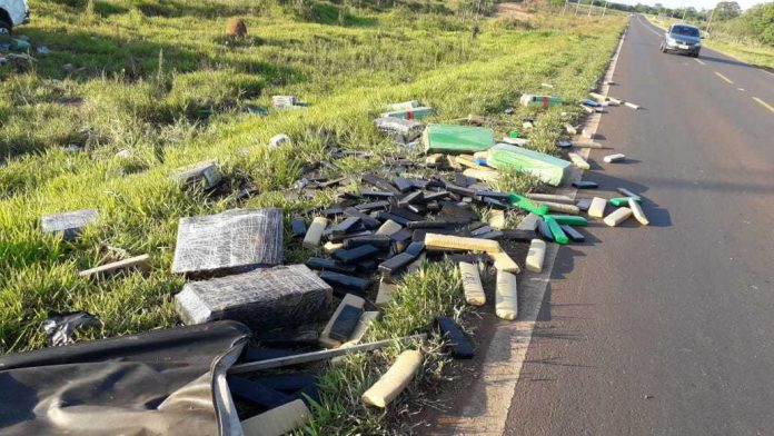 Fardos e tabletes da droga ficaram espalhados na margem da estrada. Pessoas que passavam pelo local informaram que os ocupantes correram para o lado paraguaio da fronteira.