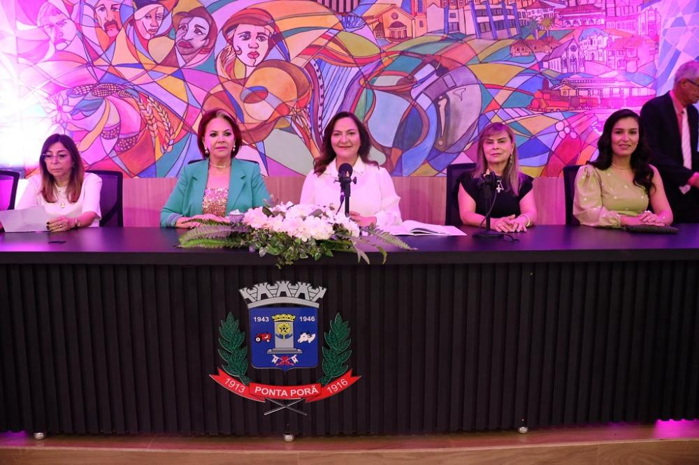 A Câmara Municipal de Ponta Porã realizou na manhã desta quarta-feira, dia 6, sessão solene em homenagem às mulheres da fronteira. O evento inicialmente presidido pelo vereador Agnaldo Miudinho e demais membros da mesa diretora, contando com a presença do secretário municipal de Governo, Fábio Caffarena, que no ato representou o prefeito Eduardo Campos, logo passou a ser comandado pela vice-presidente, Anny Espínola, acompanhada das demais vereadoras, Kamila Alvarenga, Lourdes Monteiro e Neli Abdulahad. Também fizeram parte da composição da mesa, Emne Mourad Boufleur, presidente da Associação dos Pais e Amigos dos Autistas; Thalita Beatriz Antunes Klais, secretária municipal de Meio Ambiente; e Raquel Caroline Lageano Quintino, secretária de Desenvolvimento Regional, Indústria, Comércio e Turismo.