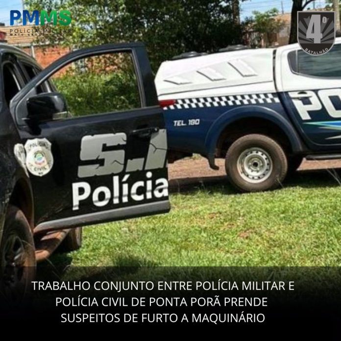 Na manhã desta segunda-feira (20), por volta das 9h15, uma ação conjunta entre a Polícia Militar e a Polícia Civil de Ponta Porã resultou na prisão de dois homens, de 32 e 43 anos, suspeitos de furtarem equipamentos de maquinário pertencentes a uma empresa de engenharia responsável por obras na região.